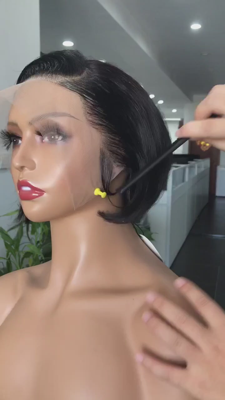 Perruque numéro 01: Pixie cheveux brésiliens Couleur naturelle, 13×4 lace frontale, 250% de Densité