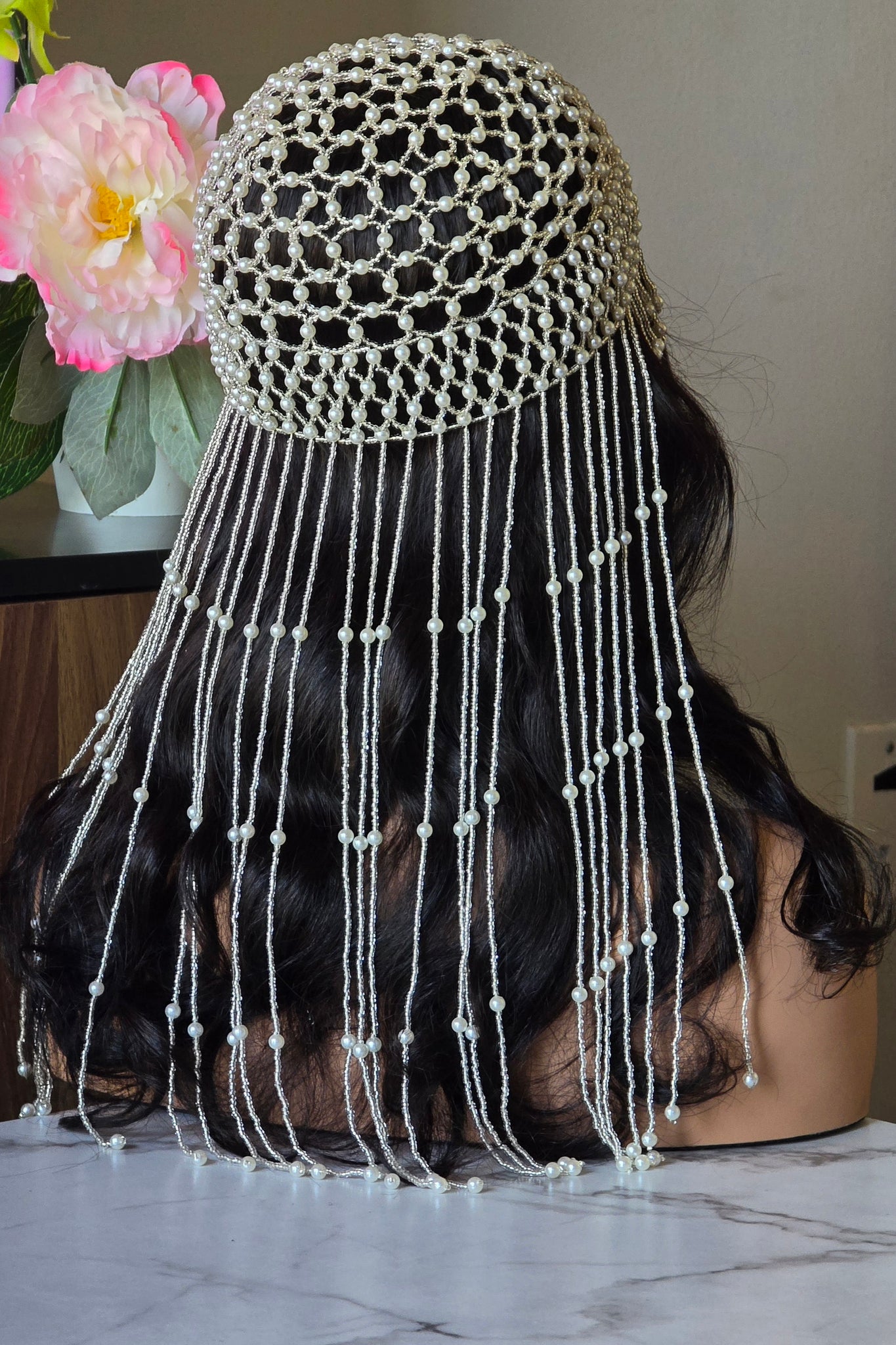 • Charger l'image dans la galerie, Accessoire de tête en perles blanches pendantes - Taille M