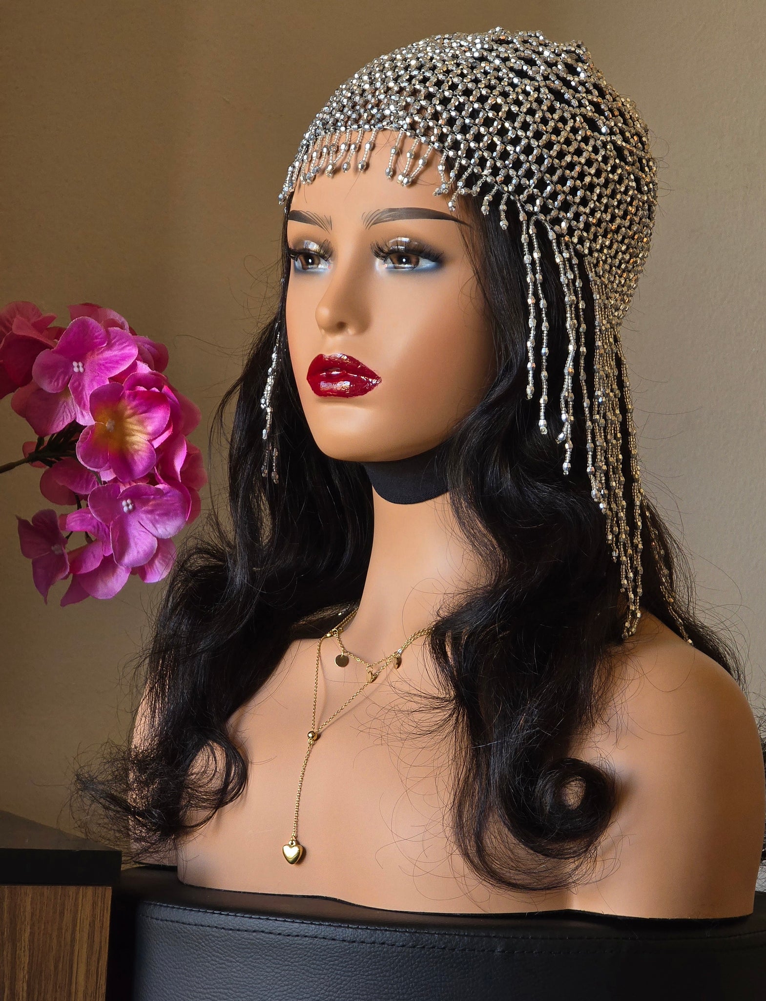 Accessoire de tête élégant avec perles couleur argent pendantes