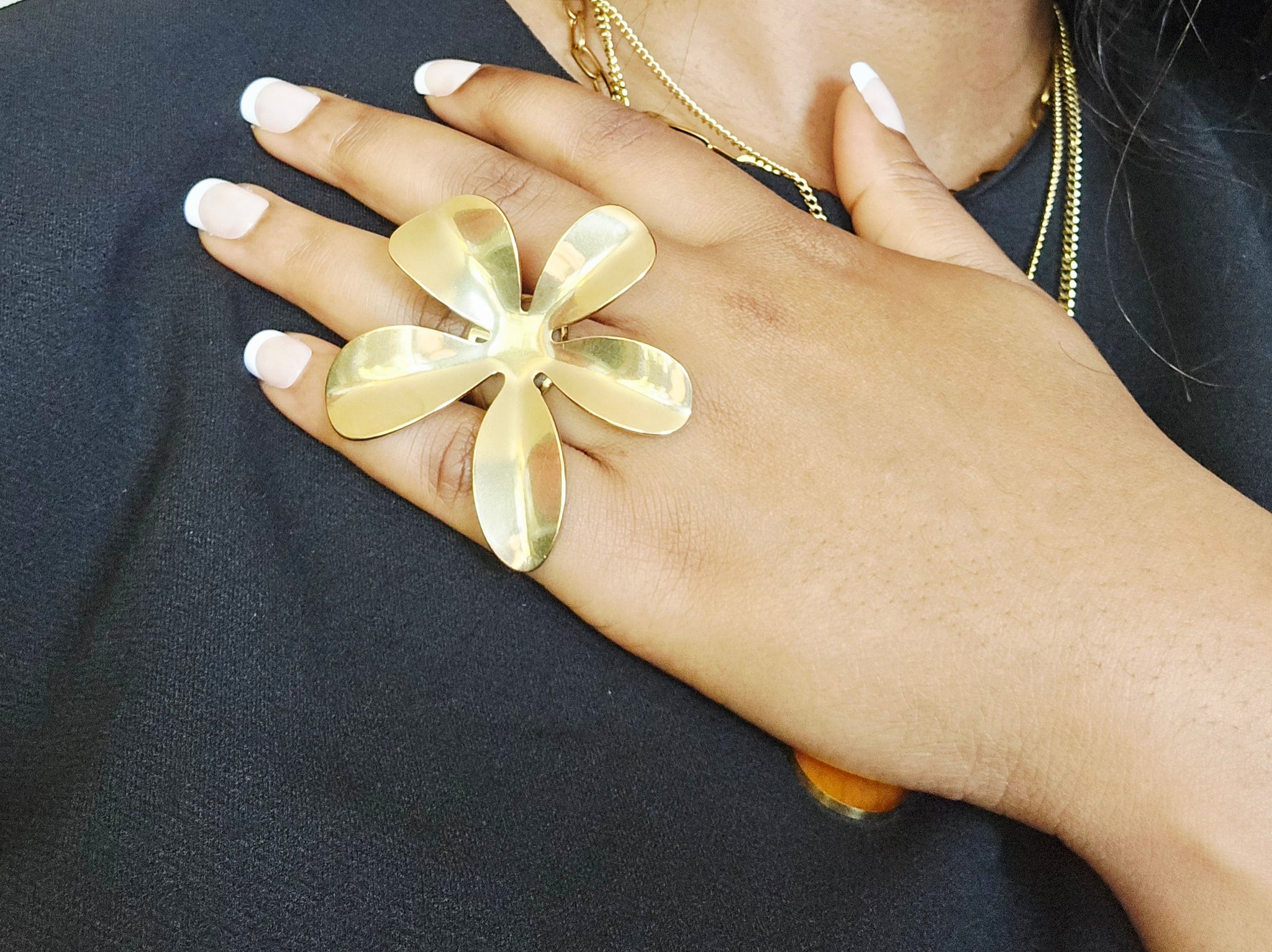 Le design audacieux présente une fleur avec les finitions soignées, à la fois polie et brossée.La bague est légère et confortable.